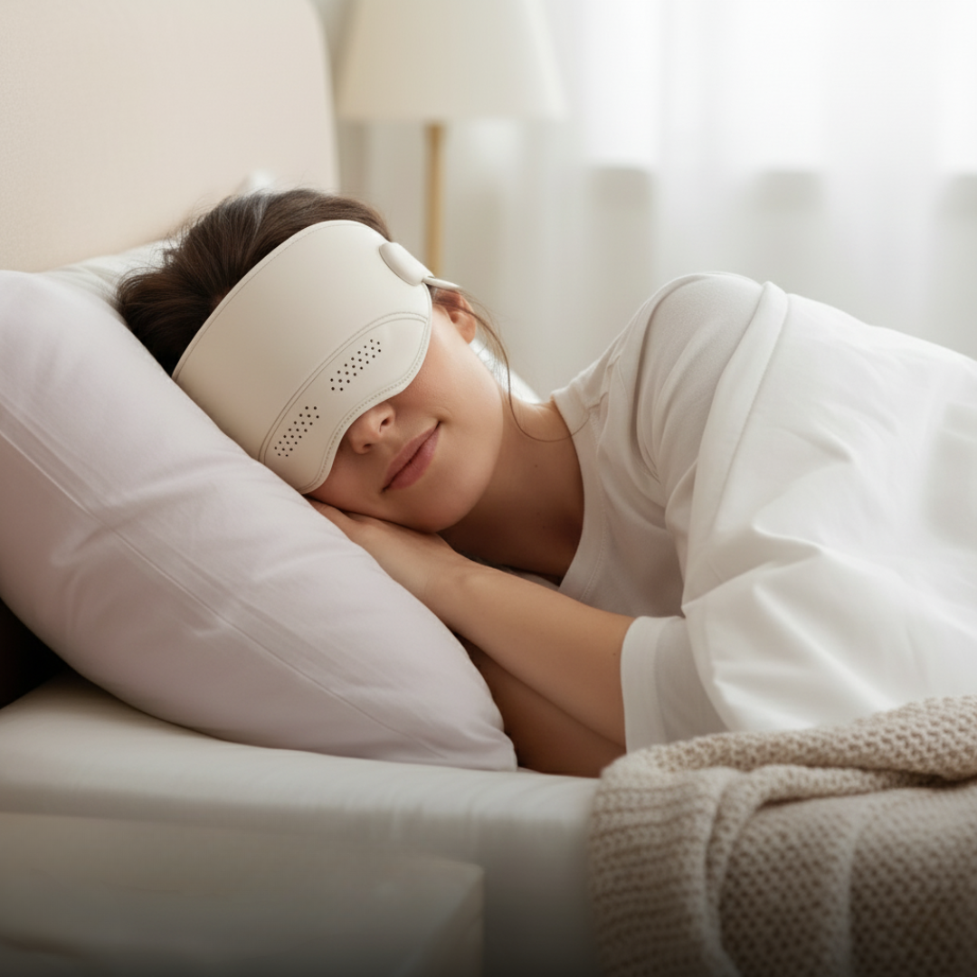 The Sleepilot™ Smart Mask uses gentle heat and temple massage to relax facial muscles, relieve tension, and calm your mind.